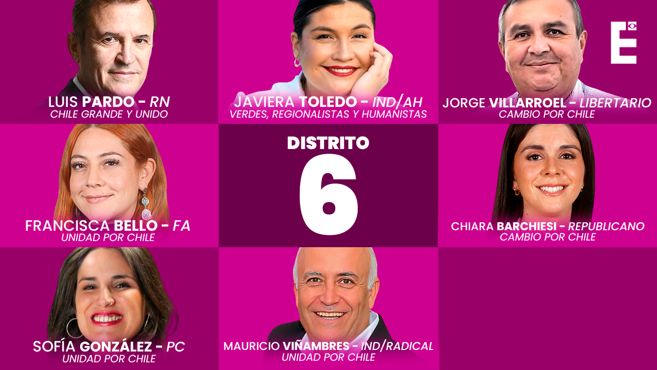 Los posibles candidatos a diputado por el distrito 6, correspondiente a las comunas de Cabildo, Calle Larga, Catemu, Hijuelas, La Calera, La Cruz, La Ligua, Limache, Llaillay, Los Andes, Nogales, Olmué, Panquehue, Papudo, Petorca, Puchuncaví, Putaendo, Quillota, Quilpué, Quintero, Rinconada, San Esteban, San Felipe, Santa María, Villa Alemana, Zapallar, todas comunas de la región de Valparaíso, son los siguientes: