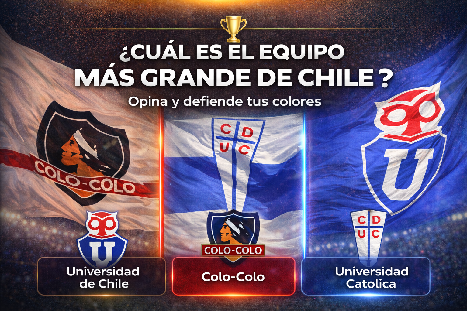 En esta ocasión vamos a elegir al equipo más grande y popular de Chile, para esto hemos elegido 6 equipos del fútbol chileno, Colo -Colo, Universidad de Chile, Universidad Católica, Deportes Concepción, Cobreloa y Santiago Wanderers. Si eres de otro equipo puede elegir la opción «otro».