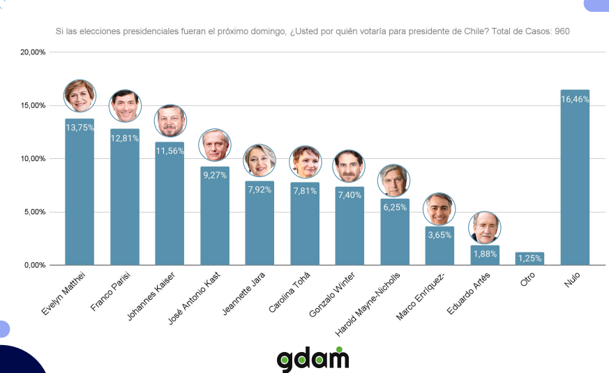 El estudio muestra que Evelyn Matthei lidera las preferencias con un 15, 75%, Franco Parisi por su parte obtiene un 12,81%, el candidato del partido Libertario, Johannes Kaiser, completa el podio con un 11,56%.