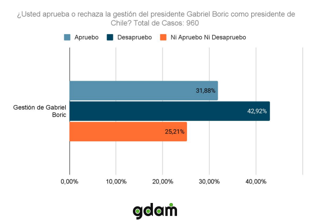 La encuesta también mide la gestión del presidente Gabriel Boric, donde la aprobación llega al 31,88%, mientras que la desaprobación queda en 42,92%, las personas que ni aprueban ni desaprueban son el 25,21% de las preferencias.