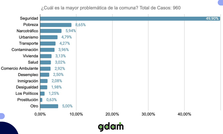 La última pregunta en relación a las problemáticas de la comuna, el 49,9% considera que el tema de la seguridad es el más importante, seguido por la pobreza con un 8,65%, lo siguen narcotráfico, urbanismo y transporte.