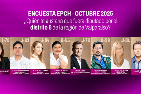 Encuesta Diputados EPCH | Distrito 6 – Octubre 2025 Distrito 6 (Cabildo, Calle Larga, Catemu, Hijuelas, La Calera, La Cruz, La Ligua, Limache, Llaillay, Los Andes, Nogales, Olmué, Panquehue, Papudo, Petorca, Puchuncaví, Putaendo, Quillota, Quilpué, Quintero, Rinconada, San Esteban, San Felipe, Santa María, Villa Alemana, Zapallar). Las elecciones parlamentarias se realizarán el 16 de noviembre…